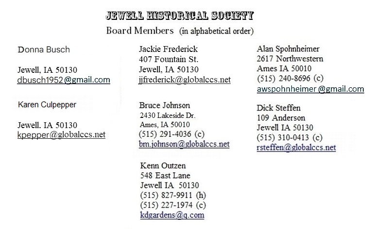 The Jewell Historical Society is working to catalog, preserve and display items such as articles, documents, photographs etc. which are important to the history and heritage of Jewell Junction, Iowa.