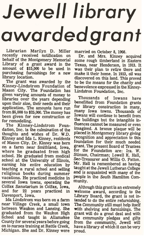 Jewell Librarians in the Montgomery Memorial Library have included Helen Harwood (1947-1948), Vivian Nye (1948-1950), Florence Thompson (starting 1958), and Marilyn Miller.