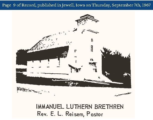 Before this wood framed North St. Petrie Church was moved to Jewell, the Immanuel Lutheran Brethern Church was organized in Jewell on May 11, 1951 under the leadership of Pastor Joseph Aarhus. The church began with charter members who moved quickly to start, build and complete a basement church at this corner of Johnson and Deckor Streets. They dedicated the new structure on December 16, 1951.