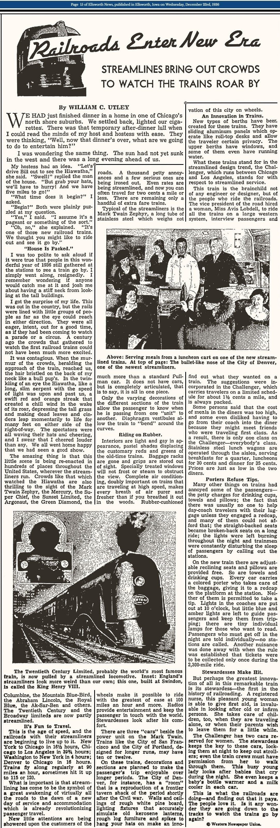 Across the C&NW system the company purchased nine streamline steam locomotives in spring, 1938 to power the Union Pacific/Chicago & NorthWestern streamliners through Iowa. They were "Super Power" locomotives and were the last steam locomotives purchased by the C&NW. They operated only for a few years powering streamline trains and were downgraded to other freight and passenger assignments as new diesels were purchased.