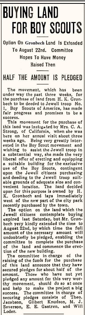 (News article published in the Jewell Record on August 10, 1916) Option On Gronbech Land Is Extended To August 22nd. Committee Hopes To Have Money Raised Then HALF THE AMOUNT IS PLEDGED The movement, which has been underway the past three weeks, for the purchase of land from H. K. Gronbech to be deeded to Jewell troop No. 1, Boy Scouts of America, has made fair progress and promises to be a success. This movement for the purchase of this land was instigated by Mrs. C. A. Strong of California, when she was here on her annual visit about three weeks ago. Being very greatly interested in the Boy Scout movement and wishing to assist the Jewell troop in a substantial way, she made the very liberal offer of erecting and equippping a suitable building for the exclusive use of the Boy Scouts, contingent upon the Jewell citizens purchasing and deeding to the Jewell troop suitable grounds of adequate size and convenient location. The land decided upon for this purpose is owned by H. K. Gronbech and lays immediately west of the new part of the city park recently purchased by the town. The option on the land which the Jewell citizens contemplate buying expired last Saturday, but Mr. Gronbech very kindly extended the time to August 22nd, by which time the full amount of the necessary amount will undoubtedly be pledged, enabling the committee to conplete the purchase of the land and commence the erection of the new building. The committee in charge of