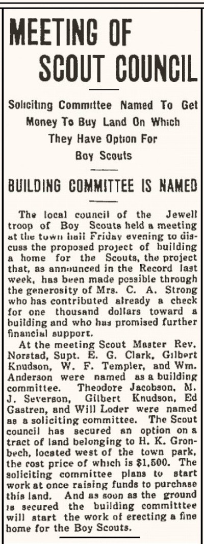 Jewell troop No. 1, Boy Scouts of America, the troop numbering 24 boys recently organized in Jewell under the leadership of Scout Master, Rev. Norstad, and assistant Scout Master, Prof. Abrahamson, is to have a splendid home of their own before the year is over. Present plans to this effect have been under consideration for the past two or three weeks and the project now appears to be a certainty. If the project goes through, as it is fully anticipated that it will, the Scouts of Jewell will have to thank for their good fortune Mrs. C. A. Strong, of California, and, aslo, the numerous public spirited citizens of Jewell. And to the former, particularly, will the boys be very grateful, for it is Mrs. Strong who took the initiative in arousing interest among the Jewell people in the project and her individual contribution will equal or exceed that of all others put together. Mrs. Strong, who years ago resided in Jewell, in the early days of the town, has always maintained a deep interest in the welfare of the town, and has evidenced her interest in many very substantial ways. Among other things, she has done a great deal in the way of improvements at Evergreen cemetery, building the two cement arches, cement curbings, flower beds, etc., and paid for and maintains the electrolier light at the town park. When Mrs. Strong came to Jewell a few weeks ago for her usual summer visit here, she at once took up with Scout Master Norstad the matter of doing something to help the Boy Scout movement in Jewell. For years she has been prominently connected with the Red Cross of America, and from her experience in this work combined with her always deep interest in everything that helps the boys, she has become deeply interested in the Boy Scout movement. She had learned of the organization of the Scout troop in Jewell and came to Jewell with a plan in mind to help the movement here. After investigating the situation, Mrs. Strong came to the conclusion that the thing the boys most need is a home of their own, including grounds and a building with appropriate equipment of all kinds for their work. She made a proposition that if Jewell citizens would provide the grounds, of adequate size and convenient location, she would contribute the money to erect and equip the building. Rev. Norstad, Wm. Anderson, B. C. Hansen, Theodore Jacobson, and Gilbert Knudson, and others were interested and have been negotiating for the grounds. Saturday evening the success of the venture became practically assured when these men made a contract with H. K. Gronbech for the purchase of his entire plot of ground the width of the town park and extending west from the town park to the west line of Mr Gronbech's land. The town recently bought for park purposes from Mr. Gronbech the land from the present west line of the park west to Deckor St., the street south from H. G. Peterson's residence. The land bought for the Scout extends west from this street to Division St., appoximately three acres. The contract price for the land is $1,500. The plan is to deed about one acre of the ground to the Boy Scouts and to hold the balance for other public uses sometime in the future. It remains to raise the $1,500 to pay for the land by public subscription among the people of Jewell, but it is anticipated that not a great deal of difficulty will be experienced in raising the money. As soon as the money is raised to buy the land and the acre is deeded to the Scouts, Mrs. Strong will begin the erection and equipment of a building and has already deposited a check for one thousand dollars towards the cost of the building. The plan is to put up a large one story substantial frame building with good floor suitable for basketball playing and other athletic activities of the Scouts, and equip it with gymnasium furnishings, etc., cabinets for the various Scout collections, etc. Possibly a cement swimming pool will be constructed upon the grounds. Mrs. Strong's contribution will be not less than one thousand dollars, as the Record understands the situation, and if the requirements are more will probably considerably exceed that sum. The