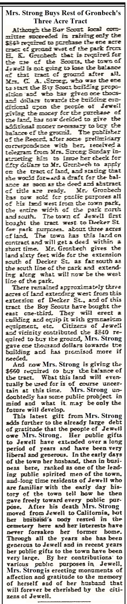 (Published October 5, 1916) Although the Boy Scout local committee succeeded in raising only the $800 required to purchase the one acre tract of ground west of the park from H. K. Gronbech that is required for the use of the Scouts, the town of Jewell is not going to lose the balance of that tract of ground after all. Mrs. C. A. Strong, who was the one to start the Boy Scout building proposition and who has given one thousand dollars towards the building conditioned upon the people of Jewell giving the money for the purchase of the land, has now decided to give the additional money necessary to buy the balance of the ground. The publisher of the Record, after some preliminary correspondence with her, received a telegram from Mrs. Strong Sunday instructing him to issue her check for fifty dollars to Mr. Gronbech to apply on the tract of land, and stating that she would forward a draft for the balance as soon as the deed and abstract of title are ready. Mr. Gronbech has now sold for public purposes all of his land west from the town park, the entire width of the park north and south. The town of Jewell first bought the tract west to Decker St. for park purposes, about three acres of land. The town has this land on contract and will get a deed within a short time. Mr. Gronbech gives the land sixty feet wide for the extension south of Decker St. as far south as the south line of the park and extending along what will now be the west line of the park. There remained approximately three acres of land extending west from this extension of Decker St., and of this tract the Boy Scouts have bought the east one-third. They will erect a building and equip it with gymnasium equipment, etc. Citizens of Jewell and vicinity contributed the $840 required to buy the ground, Mrs. Strong gave one thousand dollars towards the building and has promised more if needed. And now Mrs. Strong is giving the $660 required to buy the balance of the tract. What this land wil eventually be used for is of course uncertain at this time. Mrs. Strong undoubtedly has some public project in mind and what it may be only the future will develop. This latest gift from Mrs.