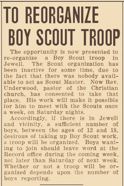 The opportunity is now presented to re-organize a Boy Scout troop in Jewell. The Scout organization has been inactive for some time, due to the fact that there was nobody available to act as Scout Master. Now Rev. Underwood, pastor of the Christian Church, has consented to take that place. His work will make it possible for him to meet with the Scouts once a week, on Saturaday nights. Accordingly,