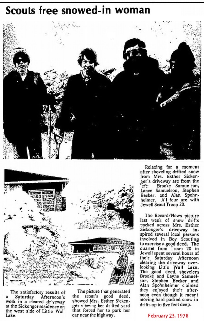 (Published January 19, 1922) The Jewell Boy Scouts will not be compelled to close up their quarters during the rest of the winter. In response to the statement published in last week's Record, that the boys require a stove to heat the Scout house, Mr. B. J. Knudson called the following day and advised us that he has a stove that he will have no need of after he moves into his new office location in the Syder building, probably next week, and he tendered the stove to the Scouts. The gift was very gladly accepted and will soon be installed so that the Scouts may continue to meet. Several good scouts in town offered to give a dollar to help buy a stove, but Mr. Knudson's kind gift made it unnecessary. |