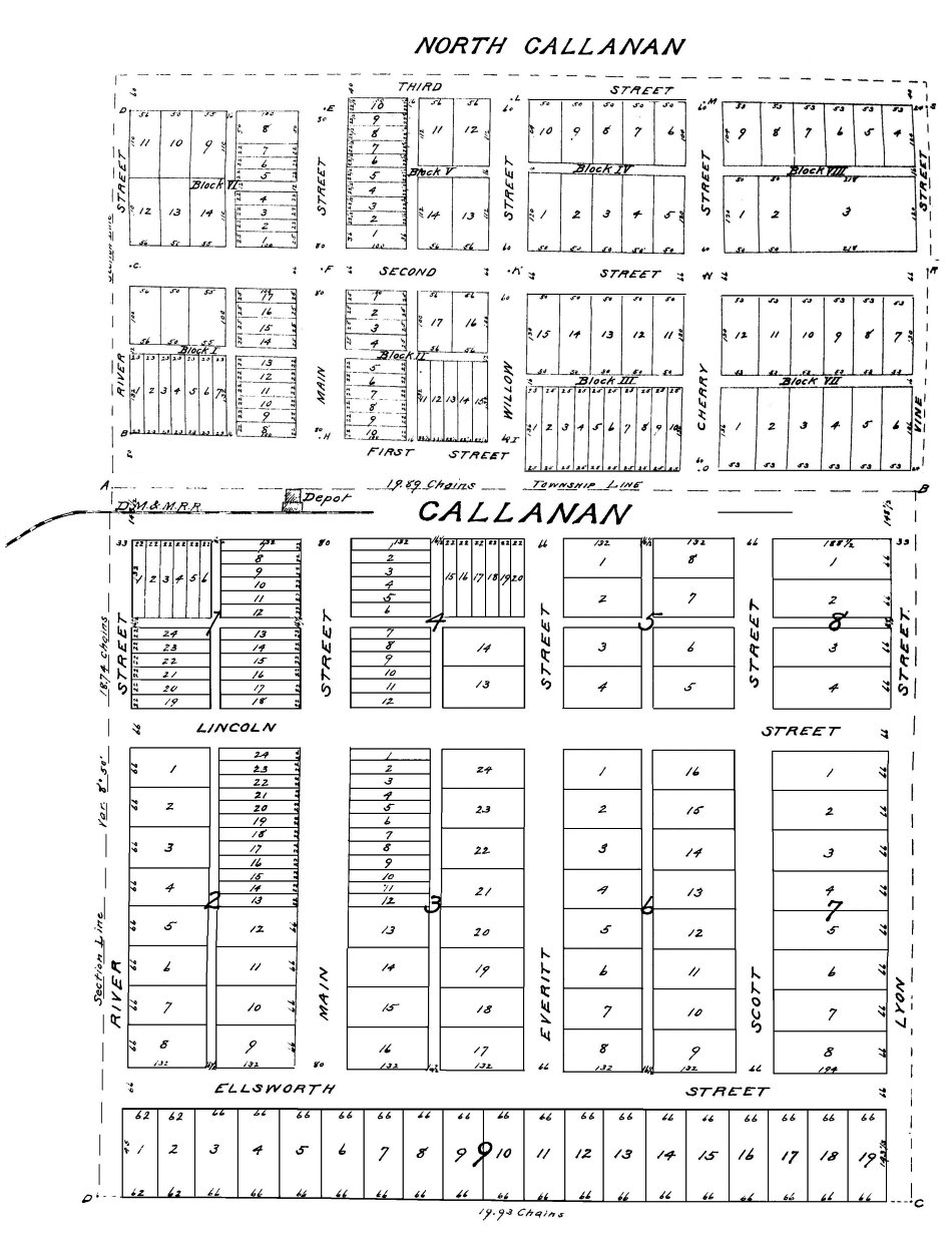 (signed) Below, you can see the enlarged portion of the above plat map of Callanan, showing where the depot was located. (Read more about this Callanan story on the next page, which explores the settlement of Callanan.)