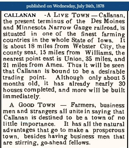 A narrow gauge railroad had been built from Ames up to the north line of Ellsworth Township, and a station was necessary, so Callanan was started; it was platted in two sections. The part lying in Ellsworth township was platted in 1878, and the addition known as "North Callanan" was within the bounds of Lyon Township, and was laid out in January, 1879. The town started with a great flourish and stores were doing a good business and a newspaper was being printed, and all bade fair to growth and prosperity until 1880. At that time the Northwestern road came through and the narrow gauge road lost out, the station was started at Ellsworth and another at Jewell, and the business people and inhabitants of Callanan moved their goods and houses either to Ellsworth or to Jewell. So Callanan became one of our "Ghost Towns."