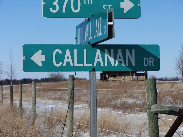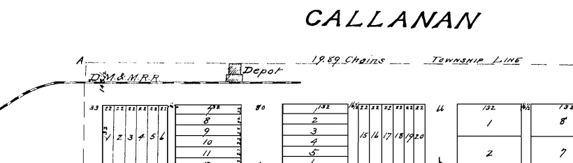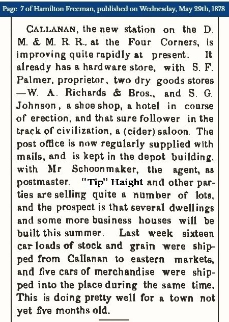 "Callanan, the new station on the D. M. & M. R. R., at the Four Corners, is improving quite rapidly at present. It already has a hardware store, with S. F. Palmer, proprietor, two dry goods stores - W. A. Richards & Bros., and S. G. Johnson, a shoe shop, a hotel in course of erection, and that sure follower in the track of civilization, a (cider) saloon. The post office is now regularly supplied with mails, and is kept in the depot building, with Mr. Schoonmaker, the agent, as postmaster. "Tip" Haight and other parties are selling quite a number of lots, and the prospect is that several dwellings and some more business houses will be built this summer. Last week sixteen car loads of stock and grain were shipped from Callanan to eastern markets, and five cars of merchandise were shipped into the place during the same time. This is doing pretty well for a town not yet five months old." |