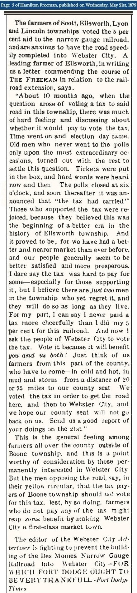 in the Webster City Hamilton Freeman: ![]() The farmers of Scott, Ellsworth, Lyon and Lincoln Townships voted the 5 per cent aid to the narrow gauge railroad, and are anxious to have the road speedily completed into Webster City. A leading farmer of Ellsworth, in writing us a letter commending the course of The Freeman in relation to the railroad extension, says, About 10 months ago, when the question arose of voting a tax to said road in this township, there was much of hard feeling and discussion about whether it would pay to vote the tax. Time went on and election day came. Old men who never went to the polls only upon the most extraordinary occasions, turned out with the rest to settle this question. Tickets were put in the box, and hard words were heard now and then. The polls closed at six o'clock, and soon thereafter it was announced that "the tax had carried!" Those who supported the tax were rejoiced, because they believed this was the beginning of a better era in the history of Ellsworth Township. And it proved to be, for we have had a better and nearer market than ever before, and our people generally seem to be better satisfied and more prosperous. I dare say the tax was hard to pay for some -- especially for those supporting it, but I believe there are just two men in the township who yet regret it, and they will do so as long as they live. For my part, I can say I never paid a tax more cheerfully than I did my 5 per cent for this railroad. And now I ask the people of Webster City to vote the tax. Vote it because it will benefit you and us both! Just think of us farmers from this part of the county, who have to come -- in cold and hot, in mud and storm -- from a distance of 20 or 25 miles to our county seat. We voted the tax in order to get the road here, and then to Webster City, and we hope our county seat will not go back on us. Send us a good report of your doings on the 21st." This is the general feeling among farmers all over the county outside of Boone township, and this is a point worthy of consideration by those permanently interested in Webster City. But the men opposing the road, say, in their yellow circular, that the tax payers of Boone Township should not vote for this tax, lest, by so doing, farmers who do not pay any of the tax might reap some benefit by making Webster City a first-class market town. The editor of the Webster