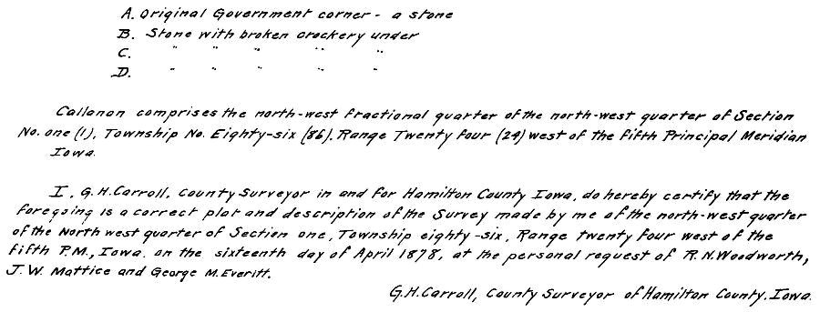 I, G. H. Carroll, County Surveyor in and for the Hamilton County Iowa, do hereby certify that the foregoing is a correct plat and description of the Survey made by me of the north-west quarter of the Northwest quarter of Section one, Township eighty-six, Range twenty four west of the fifth P.M., Iowa on the sixteenth day of April 1878, at the personal request of R. N. Woodworth, J.W. Mattice and George M. Everitt. G. H. Carroll, County Surveyor of Hamilton County,