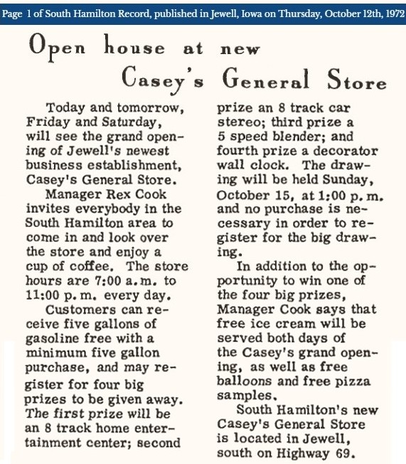 In October of 1972, Jewell was celebrating the openning of the Jewell Casey's General Store.