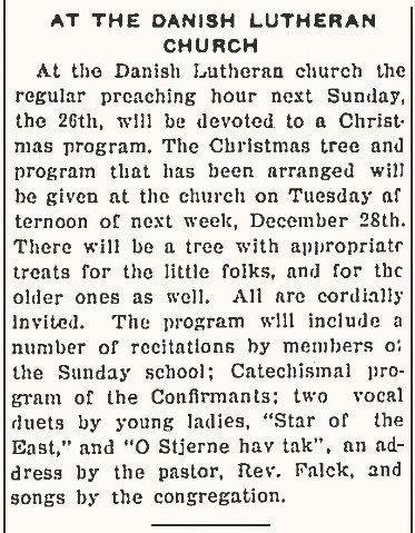 | Published September 20, 1905: The Ladies' Sewing Society of the Danish Lutheran Church will have their annual sale in the park pavilion next Saturday afternoon at 2 o'clock. Many substantial and useful garments will be sold. After the sale coffee will be served. Come prepared to buy some of the good things that will be sold. |