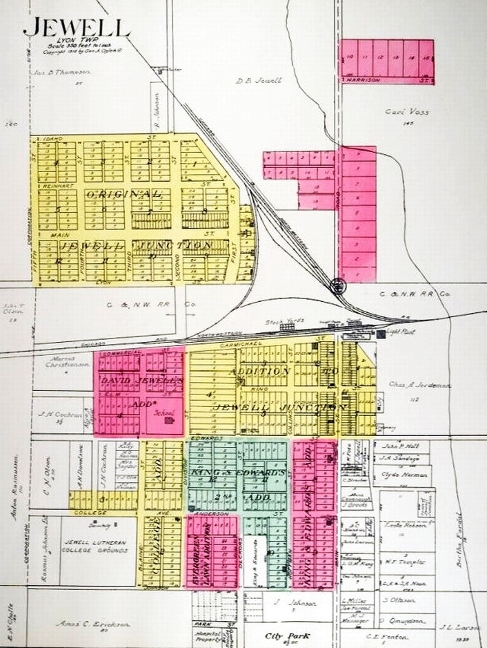Yes, the town of Jewell Junction was laid out at this railroad junction and was named for David T. Jewell. It was created in Section 28-87-24 by the real estate division of the railroad, the Western Town Lot Company. This same company platted the towns of Ellsworth, Randall, Stanhope, Stratford and Kamrar.