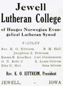 - - - - - ![]() Yes, Jewell had the first college in Hamilton County. It was established in Jewell in 1893 by the Jewell Lutheran College Association. The majority of the members of this association were Scandinavian Lutherans from the surrounding counties. In 1897 it became apparent that larger support was needed for the school, so the college and all of its property was transferred to the Iowa District of the Hague Synod, under whose management the college grew and progressed in other ways. In 1902 a ladies' dormitory was constructed, but a year later the main college building burned, killing two students, Julius Peterson and Burton Millang. In February of 1904 it was decided to build a new Main Hall. Because many Lutheran Colleges had been established in Iowa and the declining enrollment made it harder to pay bills, it was decided to close Jewell Lutheran College in 1925 after 4,236 students had been served. The college property was purchased by the Jewell School District.