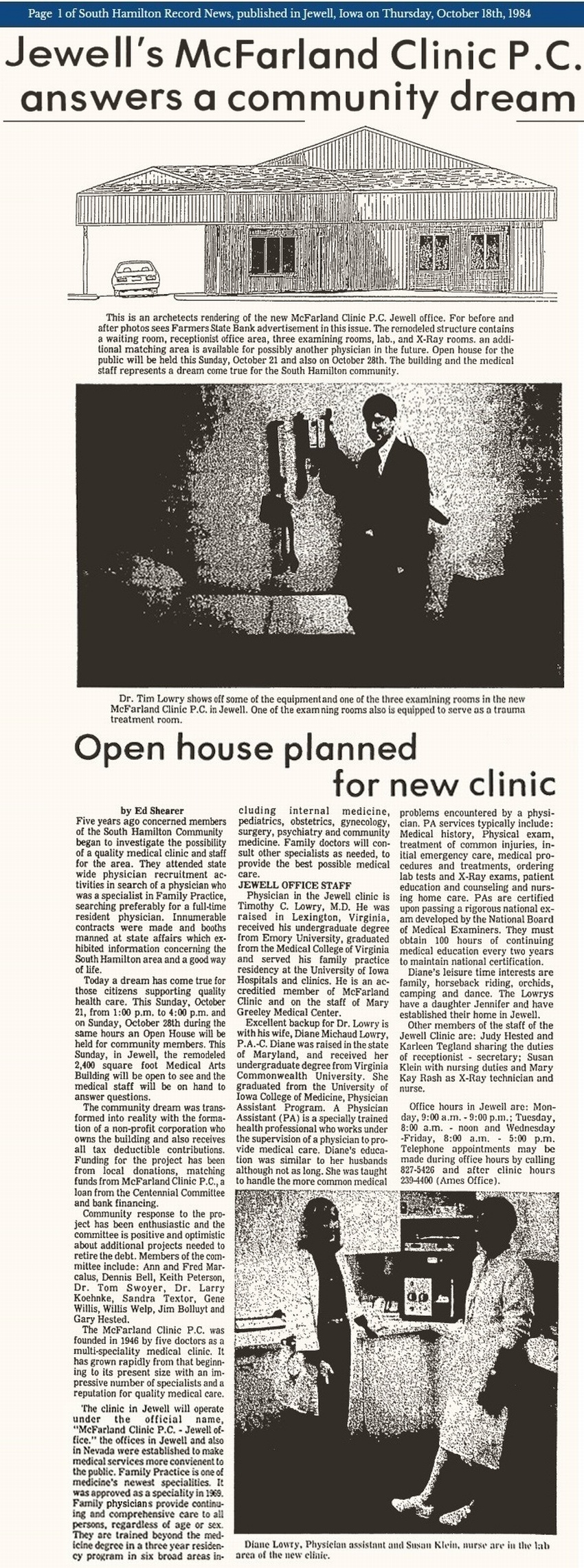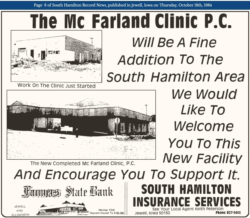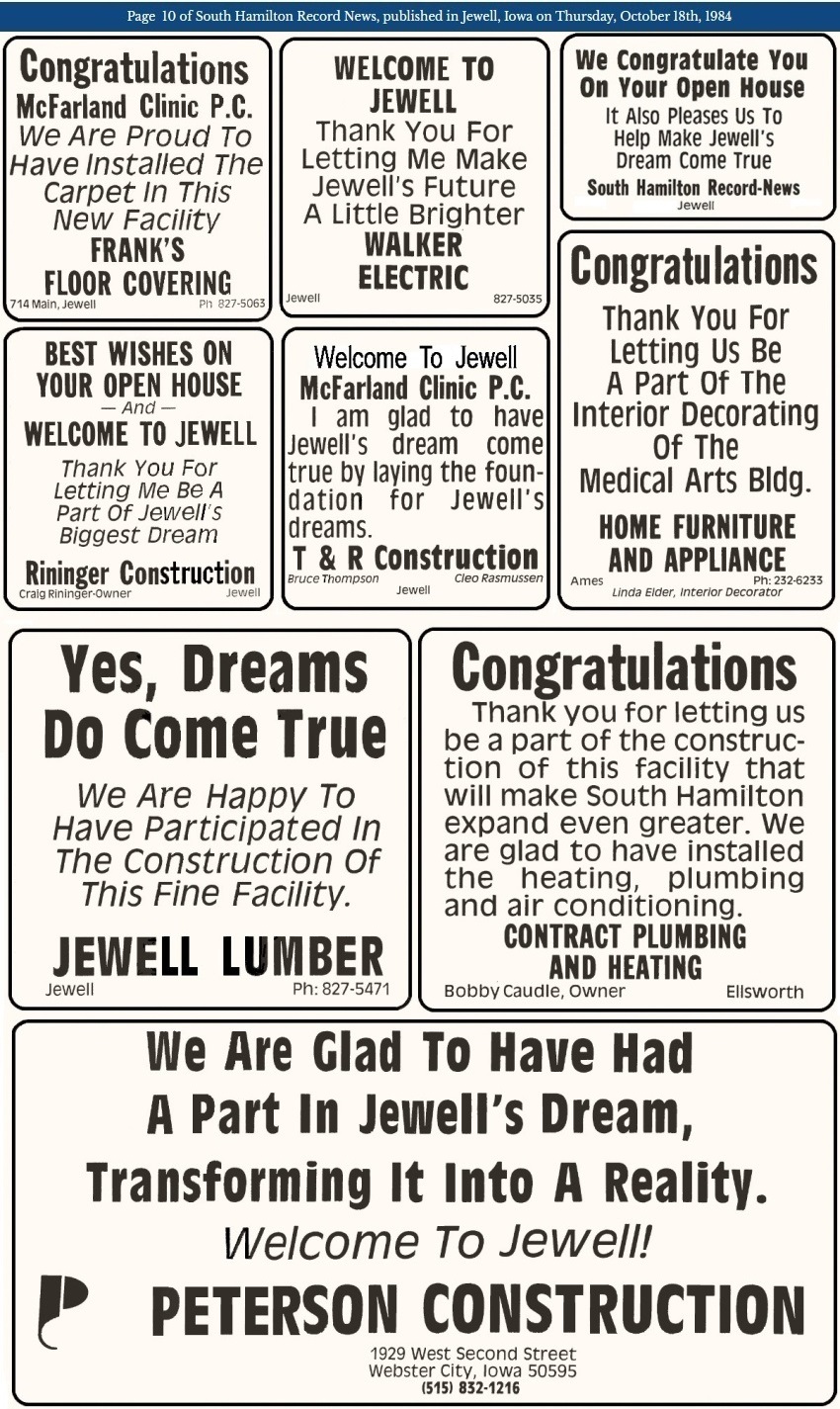 The October 18, 1984 issue of the South Hamilton Record News brought the good news that Jewell finally had a medical clinic building ready for an open house to show the public! This project had taken years of planning. The news article below was on the front page.