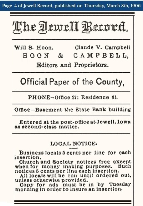 Reared at home in the acquirement of his education, Claude V. Campbell attended the public schools of Ames. He was graduated from the high school with the class of 1900, and subsequently enrolled in the Iowa State College, from which institution he was awarded his degree in 1904. After leaving college he obtained a position as a reporter on the Webster City Journal, where he acquired a general knowledge of the newspaper business. From there he came to Jewell Junction and bought a half interest in the Record and two years later he bought out his partner, thus becoming sole proprietor of the paper. He subsequently extended the scope of his activities by the purchase of the Stanhope Mail and the Randall Roundabout, which he consolidated with the Record, maintaining a separate department for each.