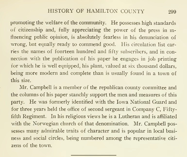 Mr. Campbell is a member of the Republican County Committee and the columns of his paper staunchly support the men and measures of this party. He was formerly identified with the Iowa National Guard and for three years held the office of second sergeant in Company C, Fifty-fifth Regiment. In his religious views he is a Lutheran and is affiliated with the Norwegian church of that denomination. Mr. Campbell possesses many admirable traits of character and is popular in local business and social circles, being numbered among the representative citizens of the town.