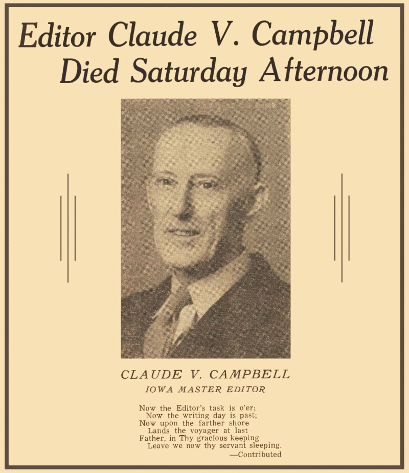 With the passing of Mr. Campbell, this community lost one of its most esteemed and prominent citizens, a man that has done more for Jewell and vicinity than any other man in the history of Jewell. As Editor of the Record, Mr. Campbell during the past 45 years worked and fought hard for the things he thought were right. His chief objective was to make Jewell a better town in which the youth could grow to manhood and womanhood. He was always alert to get behind and work for any project that would make for etter living conditions in the home, better schools and better churches. The loss of Mr. Campbell will be keenly felt for many years to come. Funeral services were held on Tuesday afternoon with a brief service at the Becker Funeral Home at 1:30 and a service at Bethesda Lutheran Church at 2:00 p.m., with Rev. M. E. Nesse, officiating. Mrs Stanley Heggen of Ames sang two songs and was accompanied by Mrs. Harry Harman at the organ. Rev. Bringle also spoke in behalf of the Riverside Bible Camp Directors. Many floral gifts and money were contributed in memory of Mr. Campbell. Internment was made in Evergreen Cemetery. Honorary pall bearers were Editor George Hanson of Ellsworth, Stanley Christensen and Palmer Erickson. The pall bearers were Nels Berven, Lewis L. Olson, Oscar Thorson, O. I. Kleaveland, John C. Anderson and Otto Fenton. Claude V. Campbell, son of Justus and Ada Campbell, was born in Milford Township in Story County, December 13, 1882 and died April 22, at Mary Greeley Hospital at the age of 67 years, 4 months and 9 days. He attended country school, Ames High School and graduated from Iowa State College at Ames in 1904. He started newspaper work the fall of 1900, as a freshman at college, being a correspondent for a dozen dailies and with his earnings, he paid his way through college. After graduating from Iowa Sate he worked a short while on an Ames paper, was reporter in 1905 for the Webster City Daily Journal until he came to Jewell in April, when he bought a half interest in the Jewell Record. In 1907 he bought the remaining interest and has been owner and editor of the Record the past 43 years. He was married to Emma Jacobson of Jewell in 1914. To this union, two children were born, Theodore J. of Los Angeles, California, and Ada Marie of Fargo, North Dakota. He is also survived by his devoted wife, two sisters, Fae Webb of Riverside, California and Mabel Campbell of Ames, a brother, Floyd of Carlsbad, New Mexico, one daughter-in-law, Helen Campbell, wife of Theordore J. and two grandchildren, Patricia and Michael Campbell and other relatives. Mr. Campbell was a faithful member of Bethesda Lutheran Church of Jewell. He had been secretary of the Sunday School for the past 25 years and was secretary of Bethesda Church and treasurer of the Building Fund of his church at the time of his passing. Mr. Campbell was a member of the Sigma Delta Chi, was a member of the Jewell Kiwanis Club until this spring and was a member of the Jewell Community and Jewell Commercial Club every year such an organization was active. He served as secretary of the Wilson Highway Association some 30 years ago to lay out was is now Highway 69. He served about 15 years on the Republican county central committee both as secreary and chairman. Has been member of the Hamilton County hospital board the past six years and served as secretary the past few years. He was active in Red Cross work and War Bond drives. Also was a member, officer and editor of the publication of the Dilg Conservation League (Izaak Walton League) from which emerged the present Iowa Conservation Commission. The improvement of Little Wall Lake was one of Editor Campell's hobbies. He worked on seven orgaized efforts to secure improvement of the lake. The last effort cominated in the organization of the Little Wall Lake Sportsmen's Club with a membership of more that 1,000 which got definite results. He was also seretary of this club. In April of last year, Mr. Campbell received the Iowa Master Editor Award. This recognition brought Mr. Campbell much joy and happiness as he received letters of congratulations from editors all over the state. |