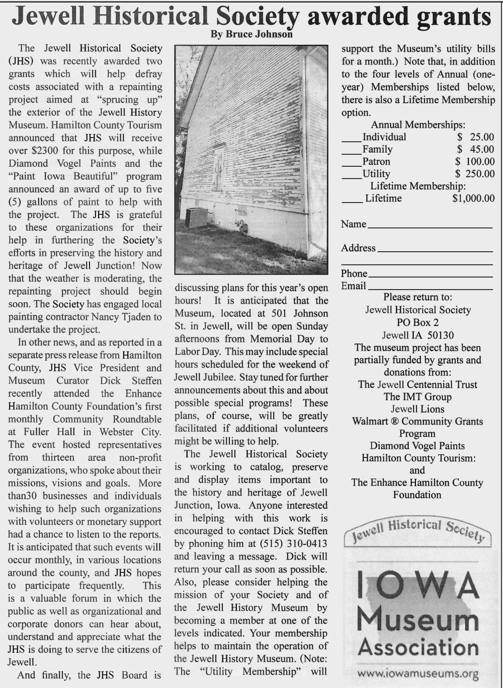 The Jewell Historical Society Museum is located at 501 Johnson Street in Jewell Junction, Iowa.