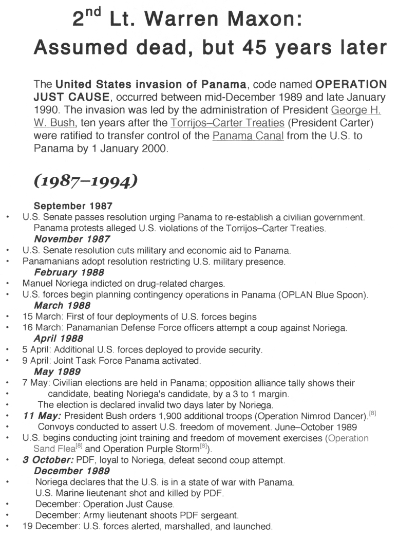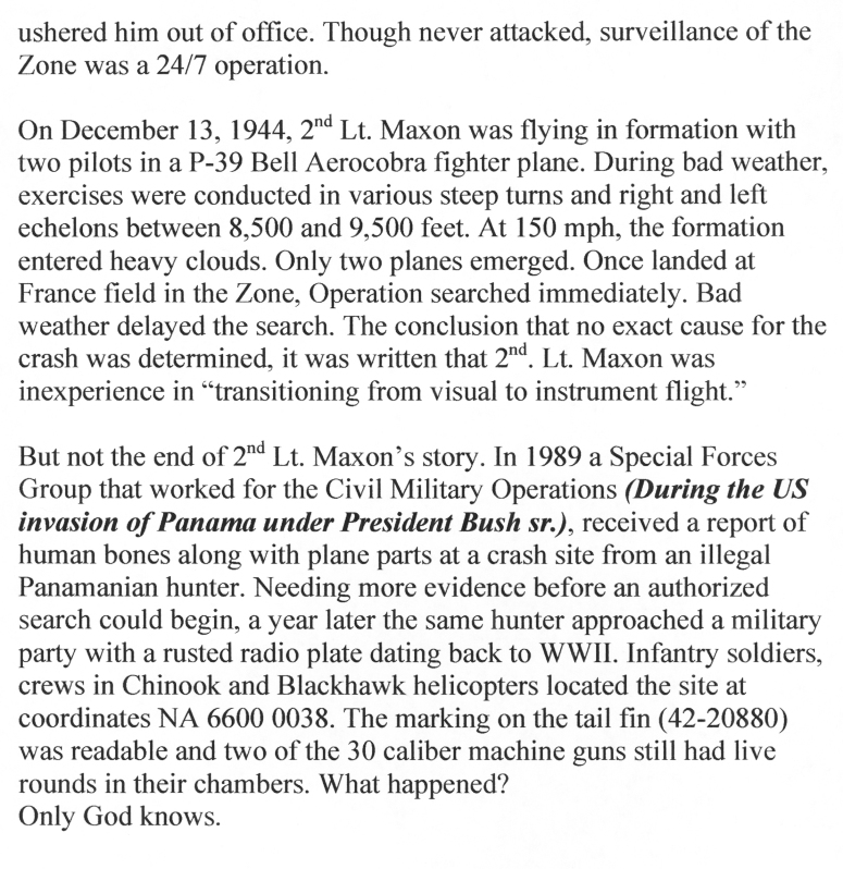 On December 13, 1944, 2nd Lt. Maxon was flying in formation with two pilots in a P-39 Aerobobra fighter plane. During bad weather, exercises were conducted in various steep turns and right and left echelons between 8,500 and 9,500 feet. At 150 mph, the formation entered heavy clouds. Only two planes emerged. Once landed at france field in the Zone, Operation searched immediately. Bad weather delayed the search. The conclusion that no exact cause for the crash was determined, it was written that 2nd Lt. Maxon was inexperienced in "transitioning from visual to instrument flight."