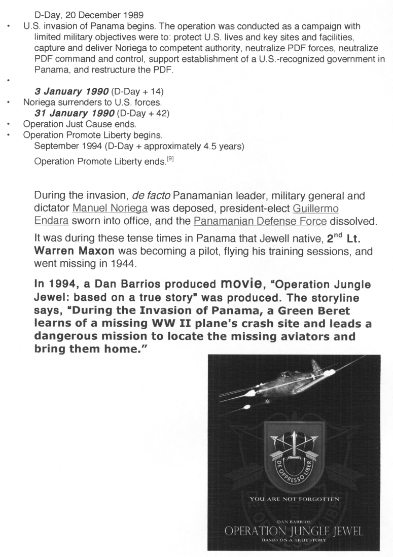 But this was not the end of 2nd Lt. Maxon's story. In 1989 a Special Forces Group that worked for the Civil Military Operations (During the US invasion of Panama under President Bush sr.), received a report of human bones along with plane parts at a crash site from an illegal Panamanian hunter. Needing more eveidence before an authorized search could begin, a year later the same hunter approached a military party with a rusted radio plate dating bach to WW II. Infantry soldiers, crews in Chinook and Blackhawk helicopters located the site at coordinates NA 6600 9938. The marking on the tail fin (42-20880) was readable and two of the 30 caliber machine guns still had live rounds in their chambers. What happened? Only God knows. |